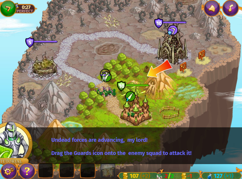 생산된 전사는 자신의 메인베이스에 칼 모양의 아이콘으로 표시가 됩니다 이것을 드래그 하여 상대 진영으로 옮겨 놓으면 그대로 공격개시가 됩니다