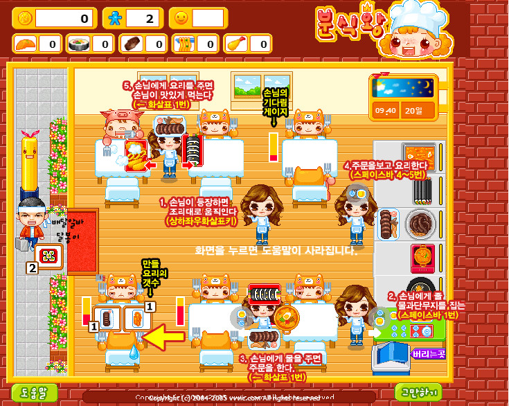 주문한 음식 앞으로 가서 스페이스바를 연타합니다 그러면 음식이 만들어지고 손에 얹게 됩니다 얹은 상태에서 다시 손님 앞으로 가서 화살표 키로 전달해주면 됩니다